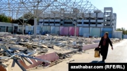 Женщина идет вдоль разрушенного базара в Ашгабате.