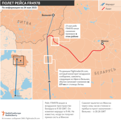 Глава компании Ryanair Майкл О'Лири назвал вынужденную посадку в Беларуси самолёта, выполнявшего рейс Афины – Вильнюс, "государственным угоном" самолёта и "воздушным пиратством" со стороны белорусских властей. Пролетая над Беларусью, экипаж получил сообщение из Минска, что на его борту находится взрывное устройство, и команду с земли приземлиться в минском аэропорту. Из данных о полёте самолёта на сайте Flightradar24 следует, что самолёт развернулся к Минску, когда уже был почти на границе с Литвой. При этом, как пишет Белорусская служба Радио Свобода, экипаж не предупредил пассажиров об изменении маршрута. После посадки был задержан находившийся на борту оппозиционный журналист, бывший главный редактор телеграм-канала NEXTA Роман Протасевич, против которого в Беларуси возбуждено уголовное дело.